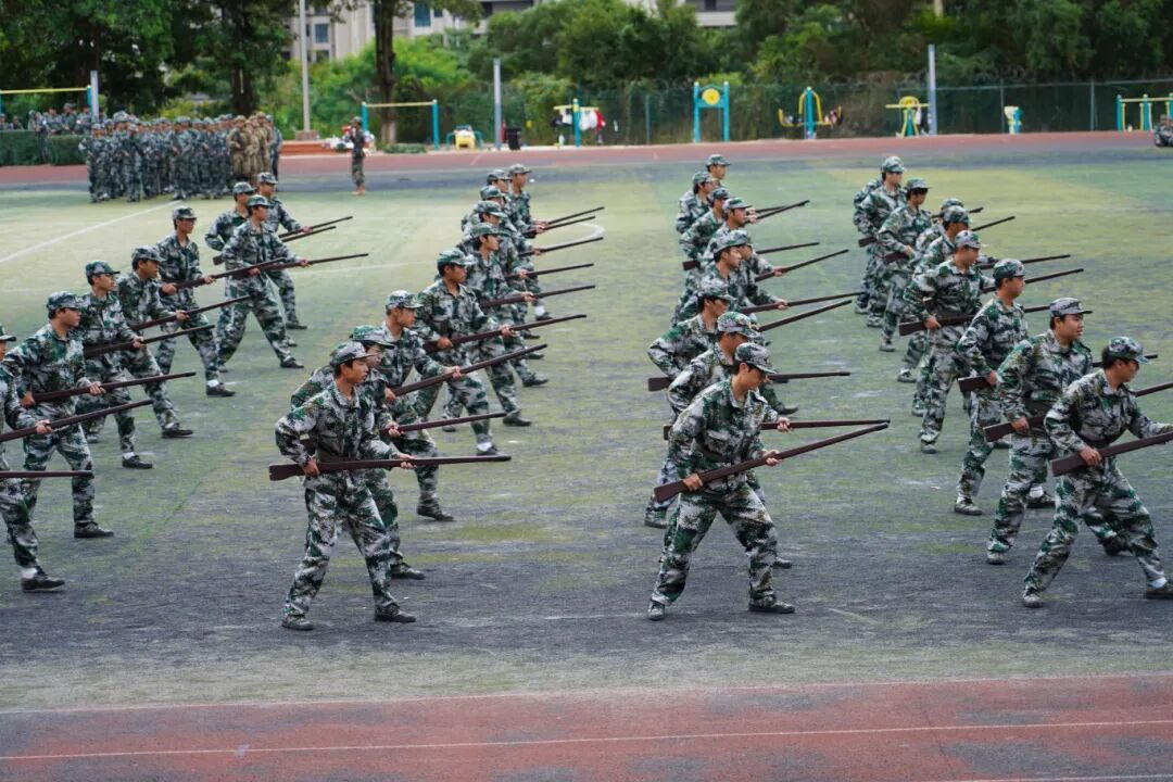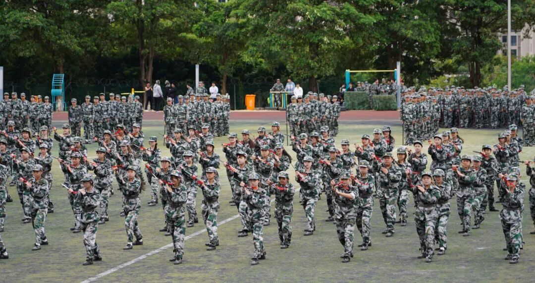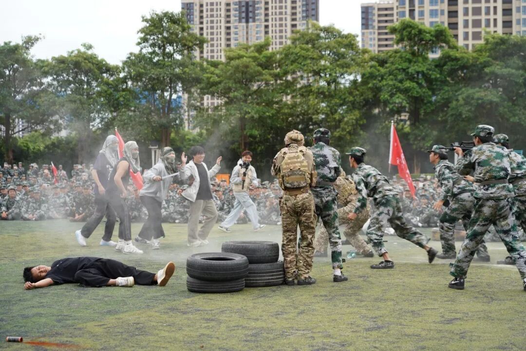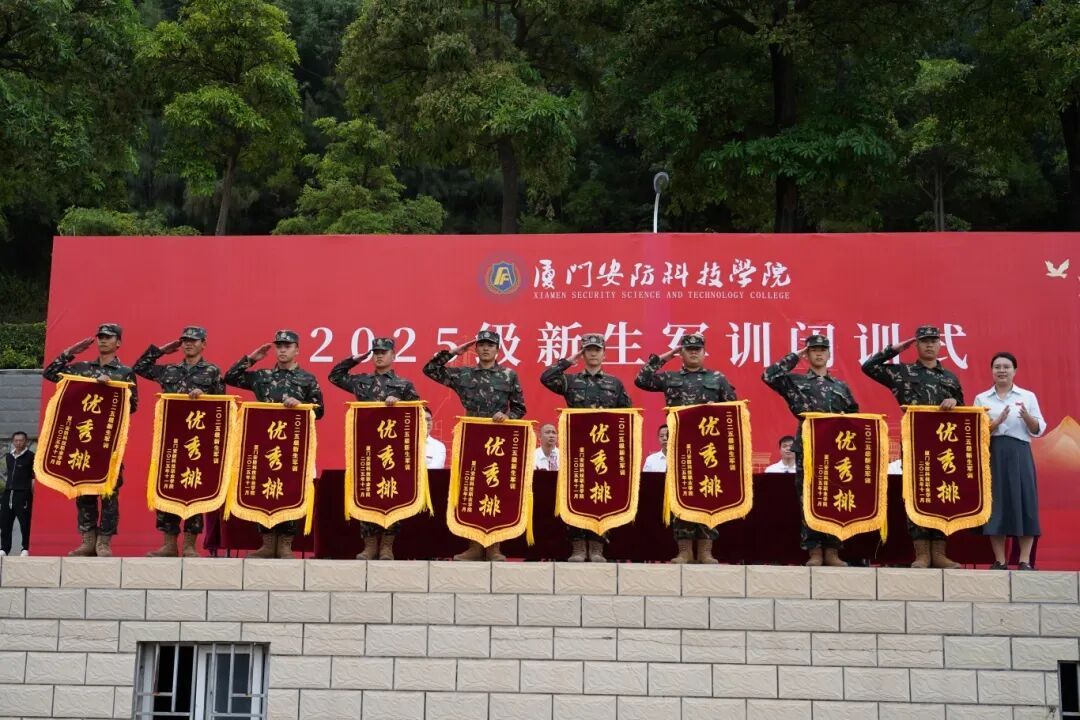 校长宋泽斌、校党委副书记陈丽春、副校长何守信、校长助理郑文华出席,各二级学院、相关职能部门负责人、全体承训教官以及2025级学生参加仪式。