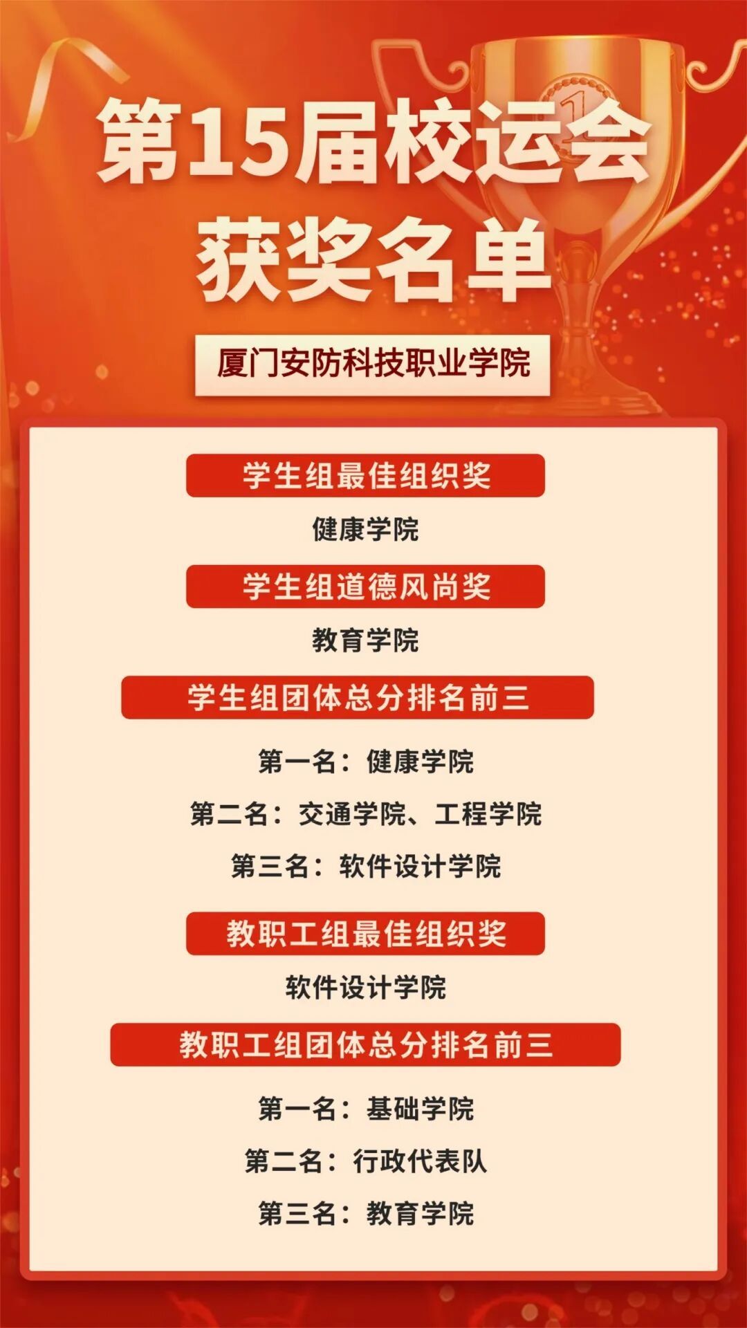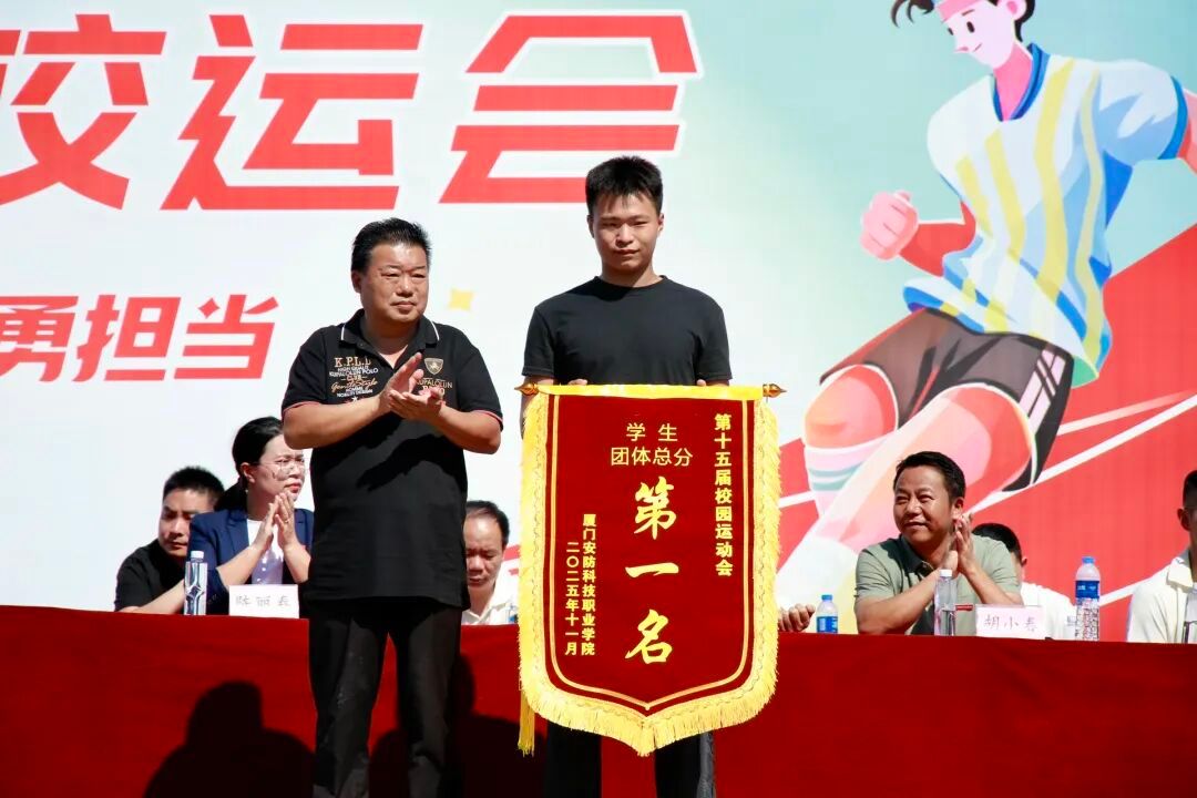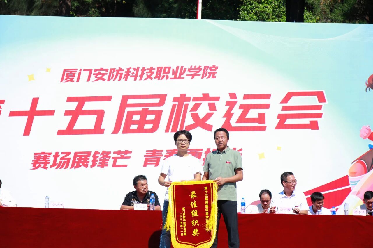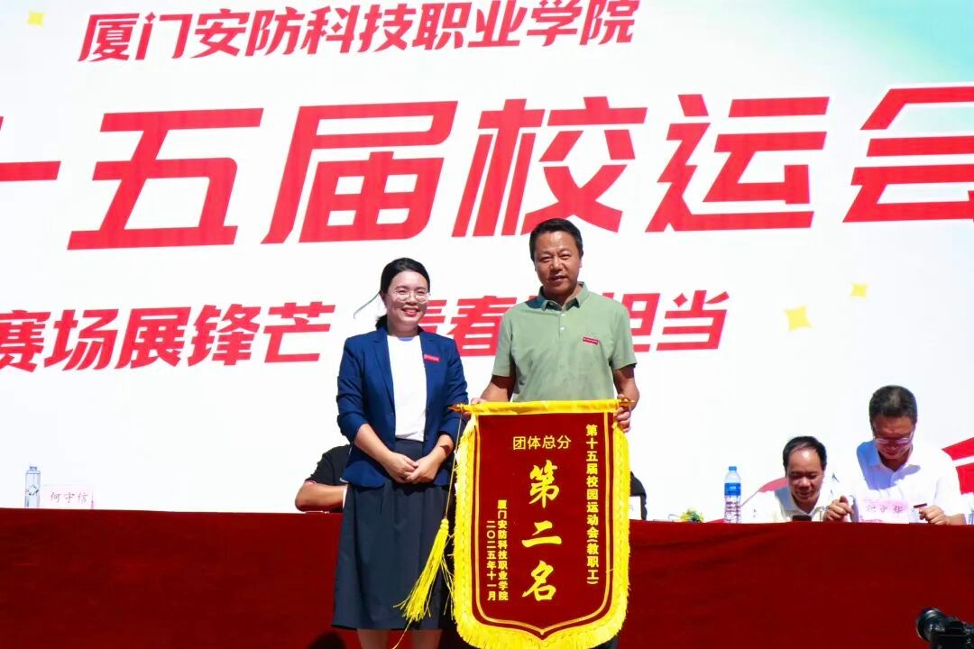 2025年11月6日上午,厦门安防科技职业学院第十五届校园运动会闭幕仪式在校田径场举行。校长宋泽斌、校党委副书记陈丽春、副校长何守信、校长助理郑文华等领导参加本次校运会闭幕仪式。仪式由副校长何守信主持。