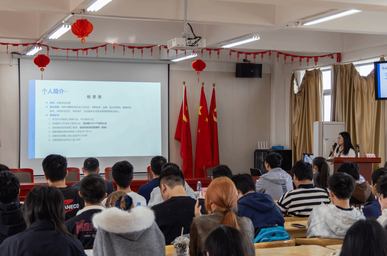 深信服厦门产教融合基地龙家锐总监、林小青总监在发言中肯定了参赛学生的出色表现,分享了网络安全行业的发展趋势与人才需求,表达了持续支持学校人才培养、推动校企深度融合的愿景,并与行业专家围绕赛事实战模块、前沿技术及就业趋势开展讲座,现场与学生进行互动交流,有效拓宽同学们的行业视野。