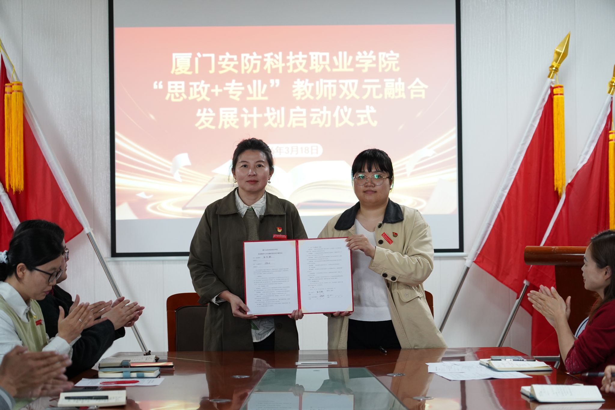 马克思主义学院副院长严元容现场宣读结对共建名单,马院吴光明、陈冬梅等四位思政教师,分别与交通学院、工程学院、软件设计学院等对应教研室结成共建小组,双方代表上台签署结对共建协议书,正式搭建思政与专业师资协同育人的联动纽带。
