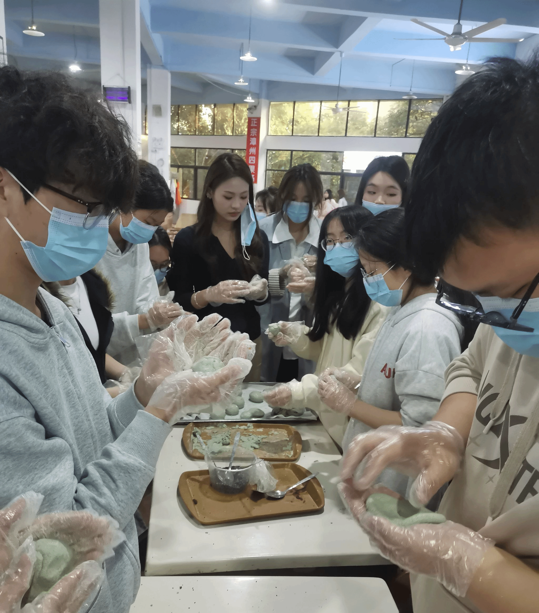 制作过程中,师生们共同完成揉面、搓团、包馅、定型等工序,现场氛围活跃而有序。部分师生凭借熟练的手法,制作出的青团外形圆润、馅料饱满;还有部分师生巧妙融入创意,将青团塑造为花朵、小动物等新颖造型。