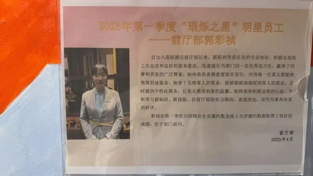 在业绩方面,郭彩祯同样表现优异。在第一季度,她在佰翔会会员邀约数及线上点评邀约数上成绩斐然,位列部门前列,为酒店的推广与口碑建设贡献了重要力量。