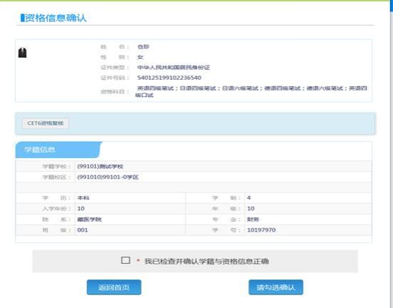 考生可以在这个页面,检查自己的照片和基本信息是否正确,查看自己的报考资格科目和进行CET6资格复核申请。
