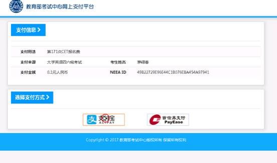 进入支付信息页面,可以选择支付宝支付,也可以选择首信易支付两种支付方式