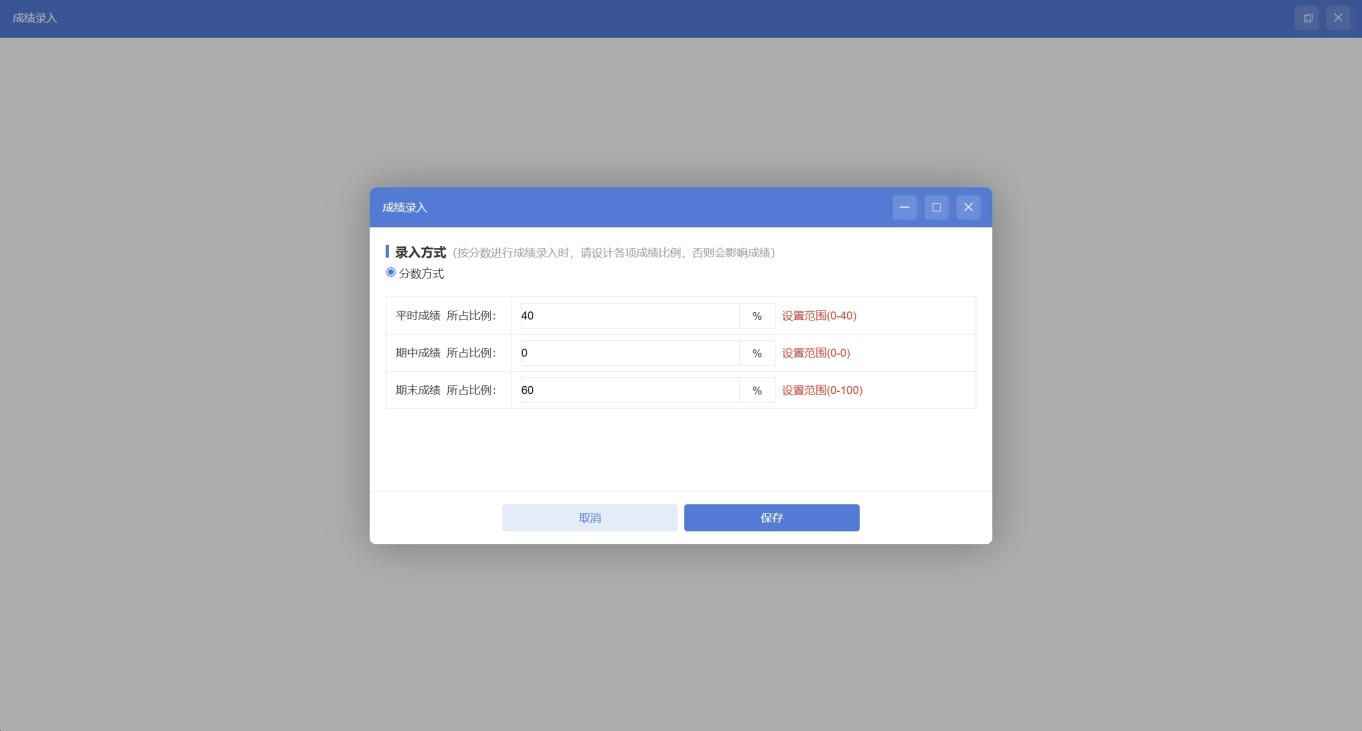 步骤3设置成绩录入比例:设置平时成绩、期末成绩的比例,两者比例相加要为100%,当比例为0时就代表不需要输,最后点击设置,然后确定。