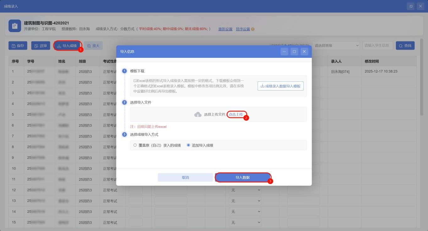 3、依次点击【导入成绩】-【选择文件】-【追加导入成绩】-【导入数据】将模板中的数据导入系统,然后点击保存