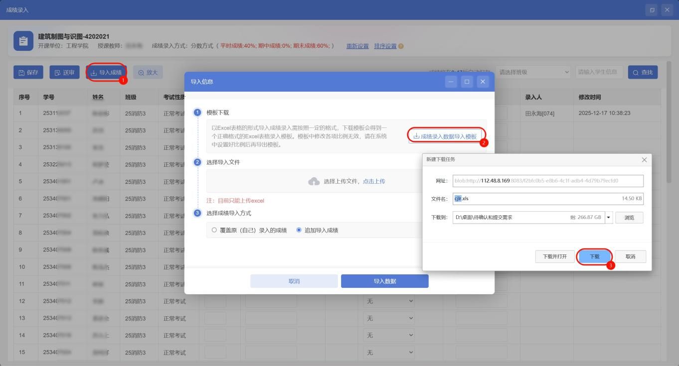 1、依次点击【导入成绩】-【成绩录入数据导入模板】下载本课程本班级的录入模板信息
