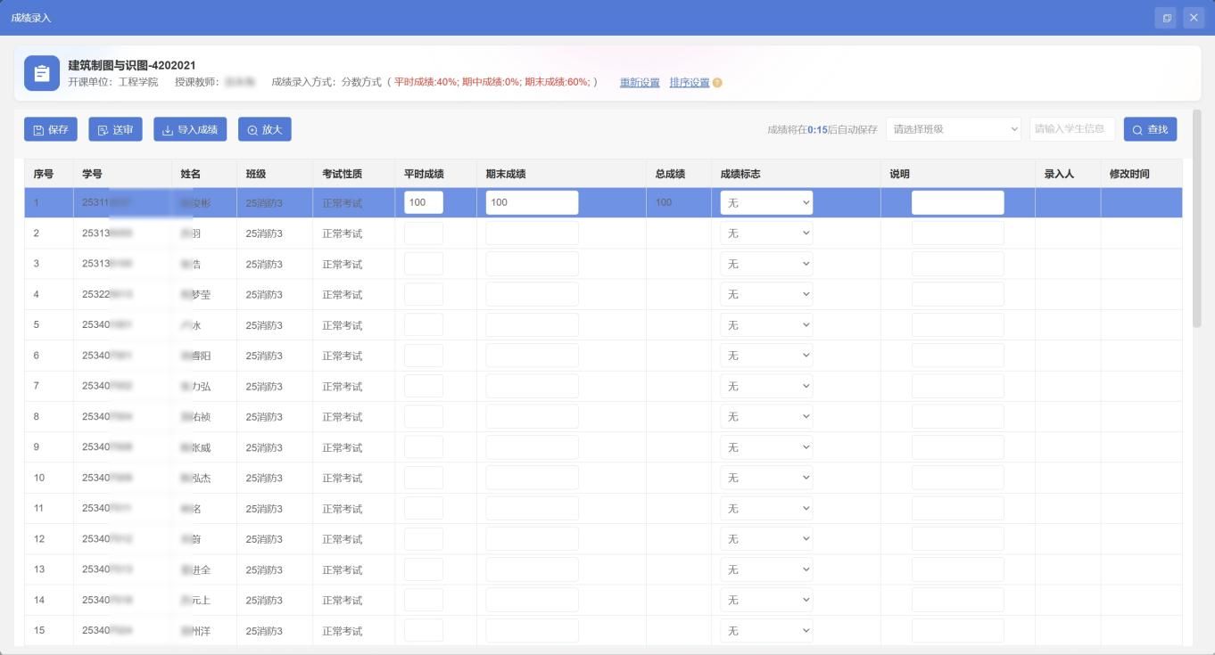 方式一:直接在系统中录入成绩,录入完以后点击保存,将平时成绩、期末成绩全部录入完以后点击送审