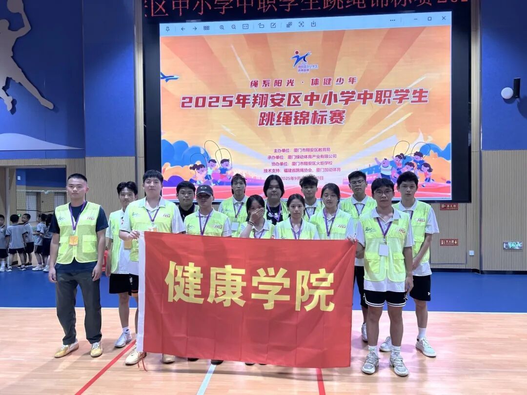 近日,翔安区中小学及中职学生跳绳比赛成功举办。赛事期间,我校健康学院组织社会体育专业学生积极参与,以志愿者与裁判员双重身份将课堂理论转化为实践能力,生动践行职业教育“学以致用、服务地方的办学理念。