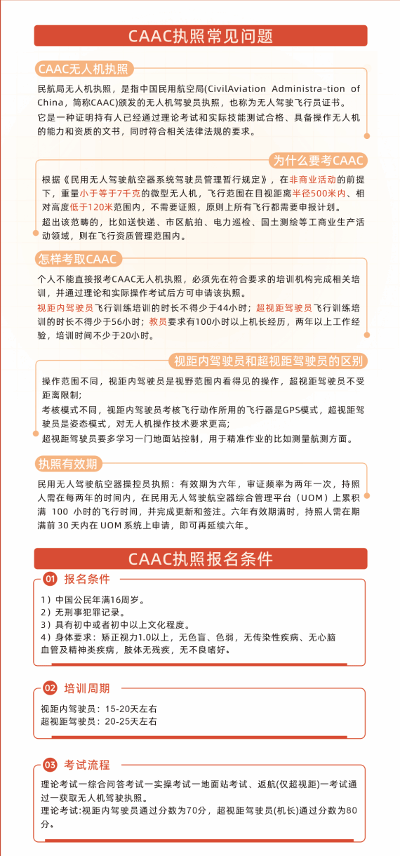 培训目的:无人机驾驶执照是由中国民用航空局飞标司向经过专业培训并通过考核的无人机飞手颁发无人机驾驶执照,通过航空理论知识和无人机运行实际操作技能,经考核取得中国民航局统一颁发的CAAC无人机操控员执照。