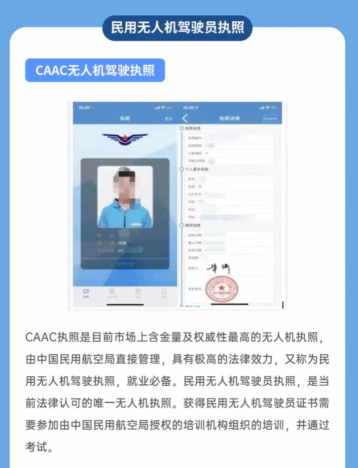 CAAC是中国民用航空局的英文缩写,相应的无人机驾驶执照由中国民航局飞行标准司直接签发,含金量极高,是无人机行业从业者入行必备的敲门砖,具有权威的法律效力。取得该执照可申报空域、申请航线、从事无人机相关的商业活动等。