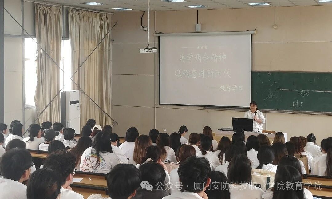 在春意盎然的三月,2025年全国两会胜利召开。教育学院分团委组织各支部团员在2025年3月27日于阶梯教室301进行两会精神宣讲会,本次会议由教育学院分团委书记黄秀英老师进行宣讲。