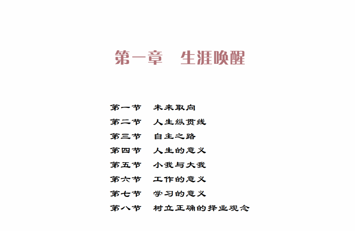 第一节未来取向 【案例】 分析【案例】中的内容,提出问题: 请你点评小赵、小孙、小李、小周、杨青峰的想法分别流露出他们思 想的哪些特征? 【生涯知识探索】 什么是未来思维?未来思维的标准是什么? (一)人类比动物的高明之处在于能够思考更远的未来 动物只能预知下一刻即将发生的事件,如家养宠物猫狗听见喂食者的呼唤,就能预知食物即将出现.然而,动物很难预见更长远未来的事件并为之进行准备,只有人类才能有预见性地规划长远未来的事情,并将长远目标分解为短期目标,进而投身于实现目标的行动之中。 (二)成熟的人比幼稚的人更善于规划未来 儿童更多考虑眼前的乐趣,而成人更多考虑未来的增益。青少年处于从儿童向成人过渡的时期,不同成熟程度的青少年在规划未来的能力上表现出明显差异。 (三)卓越的人比平庸的人更善于规划未来 无论在任何领域或者在任何历史时期,社会上最优秀、最卓越的人,总是那些善于为自己设定目标和计划的人。 (四)展望未来会促进我们的成长 展望未来,才能让人产生前进的动力.在朝目标奔跑的过程中,我们会不断地获取有价值的新经验,而不会分心于其他无益的事情,困难阻碍都不再是烦恼麻烦,而是你想要跨越的挑战。 【生涯体验活动】 活动一 你日常的心中思虑和会谈话题 活动二 测测自己的未来思维质量 活动三 评价别人未来思维的质量高低 活动四 写出自己高质量的未来打算 【生涯任务延伸】 建立自己的未来董事会 【生涯拓展阅读】 «哈佛幸福课»节选 【小结】 第二节人生纵贯线 【案例】 分析【案例】中的内容,提出问题: 请你分别点评一下以上同学对于未来职业的思考,他们对于自己将来 的职业生涯规划清晰吗? 【生涯知识探索】 一、 舒伯的生涯发展理论 (一)生涯跨度 生涯彩虹图中,第一个层面 (相当于地球的经度)代表的是横跨一生的生活广度。我们的发展生活呈现阶段性,包括考大学、工作、结婚、生孩子、养孩子、退休;每个阶段都有每个阶段的任务、状态和价值,如探索期 (15—24岁)的任务就是在学校、休闲生活和打工的经历中,进行自我探索、角色探索和职业探索;每个人都受环境和个人两方面因素的交互影响.因此,我们需要向内探索和修炼自己,向外了解世界及顺应历史和社会发展的要求,这样才能让自己朝着期待的方向发展,向下生根,向上散枝。 (二)生涯宽度 生涯彩虹图中,第二个层面 (相当于地球的纬度)代表的是纵观上下的生活空间.人在一生当中必须扮演9个主要的角色,依次是:子女、学生、休闲者、公民、工作者、夫妻、家族长辈、父母和退休者.此外,角色也活跃在4种主要的人生舞台:学校、家庭、社会和工作场所.学生结合自己的人生角色图,关注角色对自己的意义和价值,思考如何承担角色赋予的责任。 二、 中高职学生的生涯发展阶段 【生涯体验活动】 活动一 生涯幻游 生涯幻游:请轻轻闭上眼睛,想象一下,在你面前有一个水晶球,可以让你看到15年后你一天的生活写出脑海中自己15年后生活的样子。 活动二 绘制我的生命线 请在下图绘制出你过往生命中不同时间段对你产生显著影响的事件,特别是那些影响你对未来职业选择的人物和事件,以及你期待在将来发生的事件,并在相应的时间段上简要标明事件的概要以及对你产生的影响。 活动三 我的生涯彩虹图 生涯彩虹图:在每一个阶段对每一个角色的投入程度用涂颜色的方式来表示,深色面积越大表示该角色投入的程度越大,空白越多表示该角色投入的程度越小。 活动四 人生纵贯线 (一)纵观人生 (二)分享人生 【小结】 第三节 自主之路 【案例】 分析【案例】中的内容,提出问题: 你在苦恼何时才能独立吗? 你想成为自己人生的掌舵手吗? 你做过哪些自主的决定? 今天我们一起来畅所欲言吧! 【生涯知识探索】 (一)类型Ⅰ———健康型 该类型的青少年既与成人保持着良好的联系,又拥有独立自主的特征.他们在作决定时,会先征求父母、教师等成人的意见和建议,然后自主作出决策。 (二)类型Ⅱ———疏离型 该类型的青少年反抗一切成人权威,否认父母、教师等成人的期望,与成人之间的疏离感较强。他们认为,否定成人设定的规则、期望就是独立自主的表现,所以不愿听从父母、教师的劝告。 (三)类型Ⅲ———问题型 该类型的青少年不肯接纳父母、教师等成人的权威地位,与成人之间缺乏亲密的依恋关系,但同时独立自主能力也较弱,企图不断地寻求来自成人的帮助和照顾。所以,与成人的关系经常处于冲突之中.只有少数青少年与父母的关系属于此类型。 (四)类型Ⅳ———依赖型 该类型的青少年与父母、教师等成人之间存在紧密的联系;但独立自主的特征发展不充分,在认知、情感、经济等方面都依赖成人,凡事服从成人的安排,完全没有自己的想法。一旦没有父母、教师等成人的指导,他们将不知该做什么。 【生涯体验活动】 活动一 我会怎么做 活动二 大家一起来体验 活动三 我认识的 “自主名人” 活动四 班级 “自主之星” 通过【心理训练】促进理论与实践相融合,满足不同学生对提升自 身素养的需求。 心理训练1:搜一搜学校心理咨询预约电话、当地医院心理门诊预约电话,记录下来。 心理训练2: 扫一扫,看一看心理咨询的流程,并把流程和关键事项记录下来。 【生涯任务延伸】 我的 “