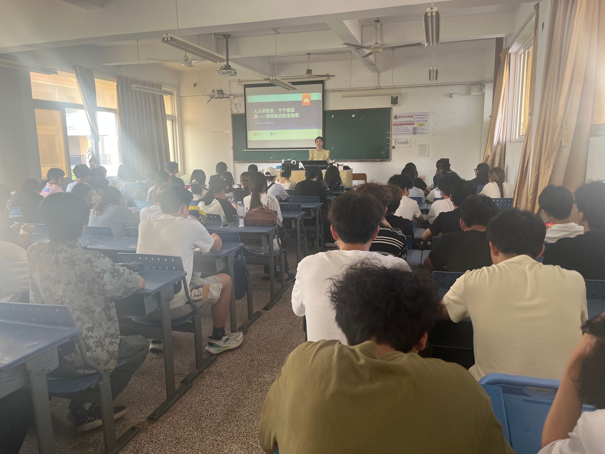 为进一步增强大学生消防安全责任意识,提升自防自救能力,坚决遏制火灾事故的发生,创造良好的学习生活环境。在班会上讲述了校园生活中易发生的消防安全事故及应对措施。针对宿舍安全隐患向大家提出了各项要求,强调禁止在宿舍吸烟、禁止在宿舍给电动自行车充电、禁止使用违规电器等,严格遵守宿舍行为规范。