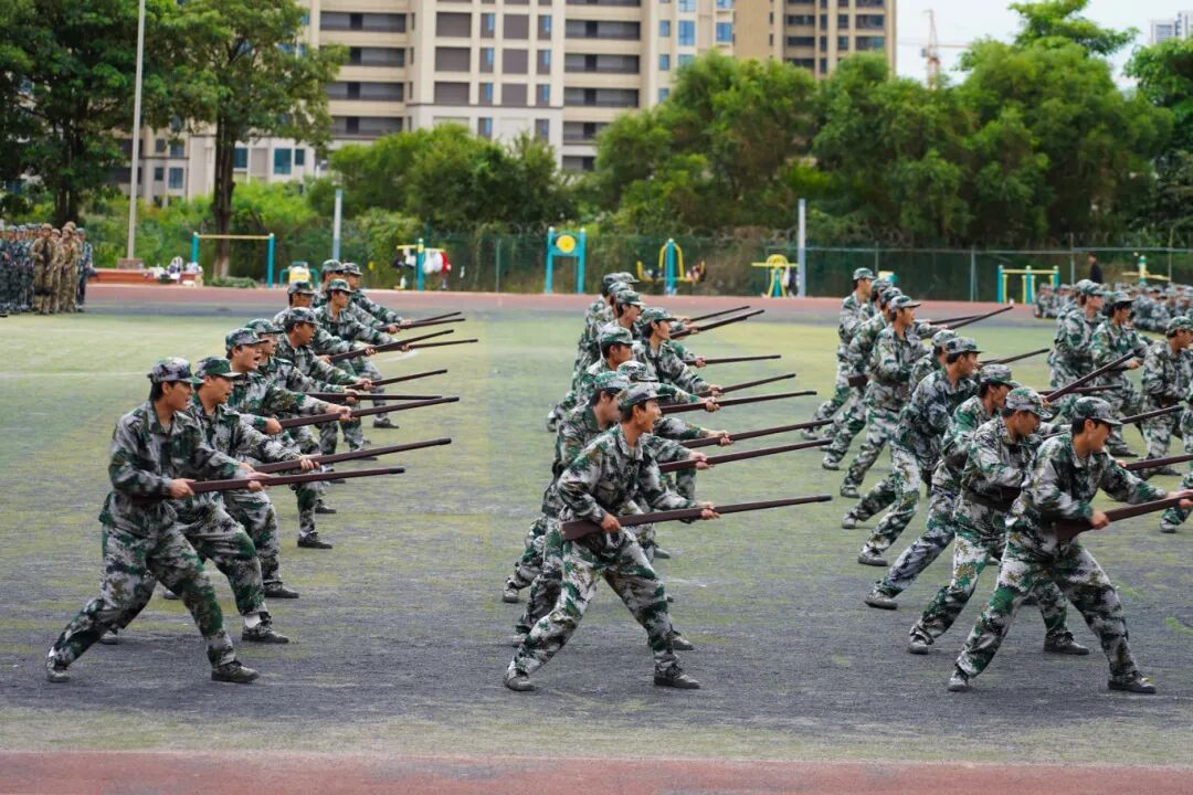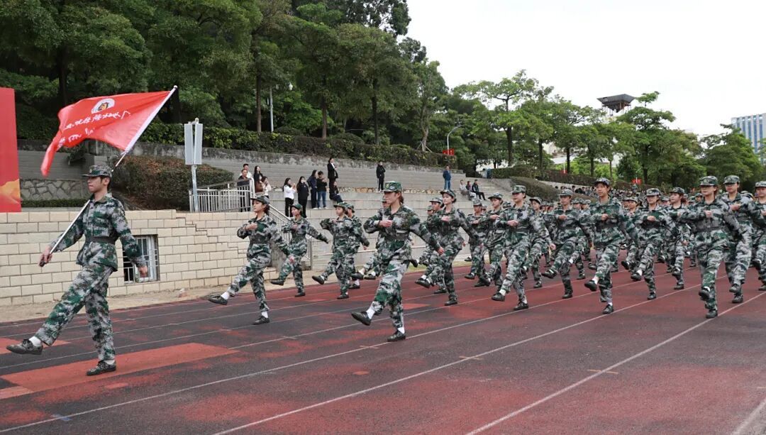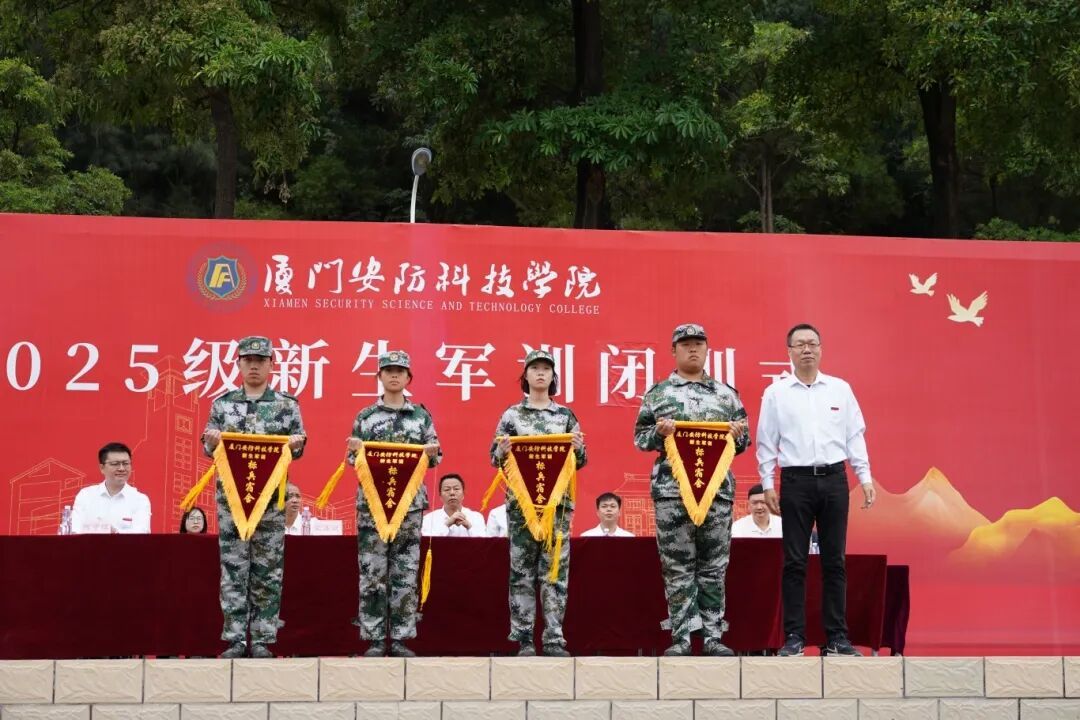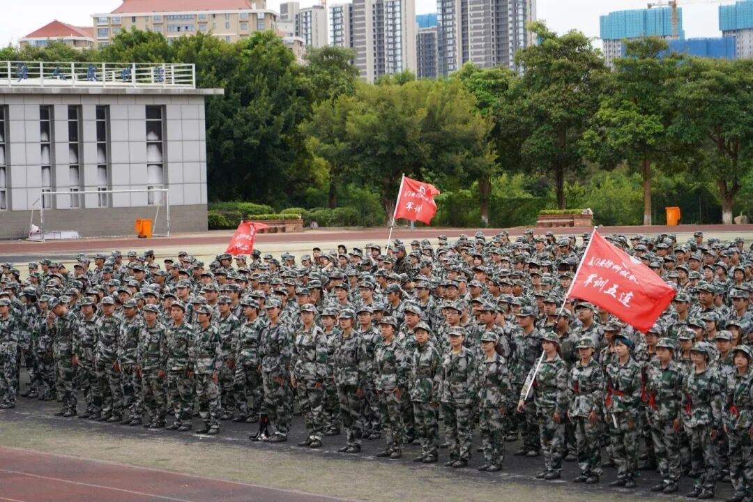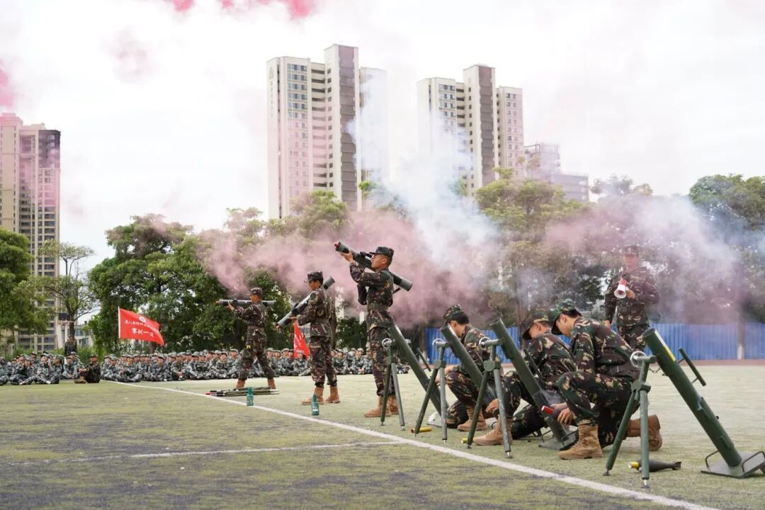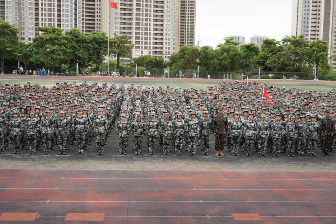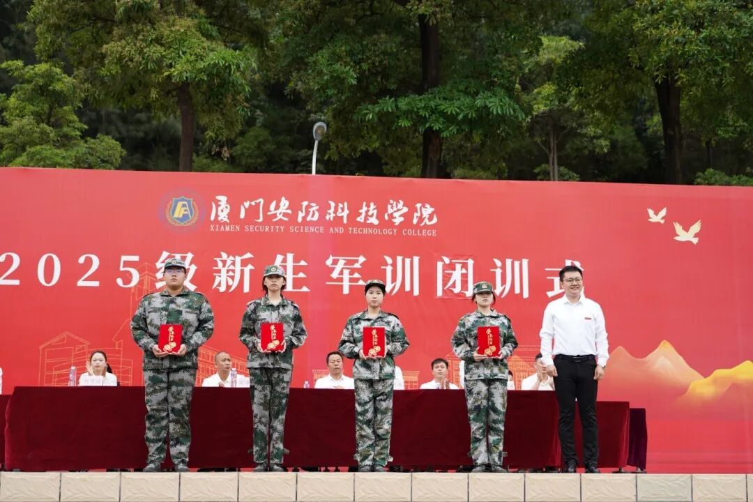 校长宋泽斌、校党委副书记陈丽春、副校长何守信、校长助理郑文华出席,各二级学院、相关职能部门负责人、全体承训教官以及2025级学生参加仪式。