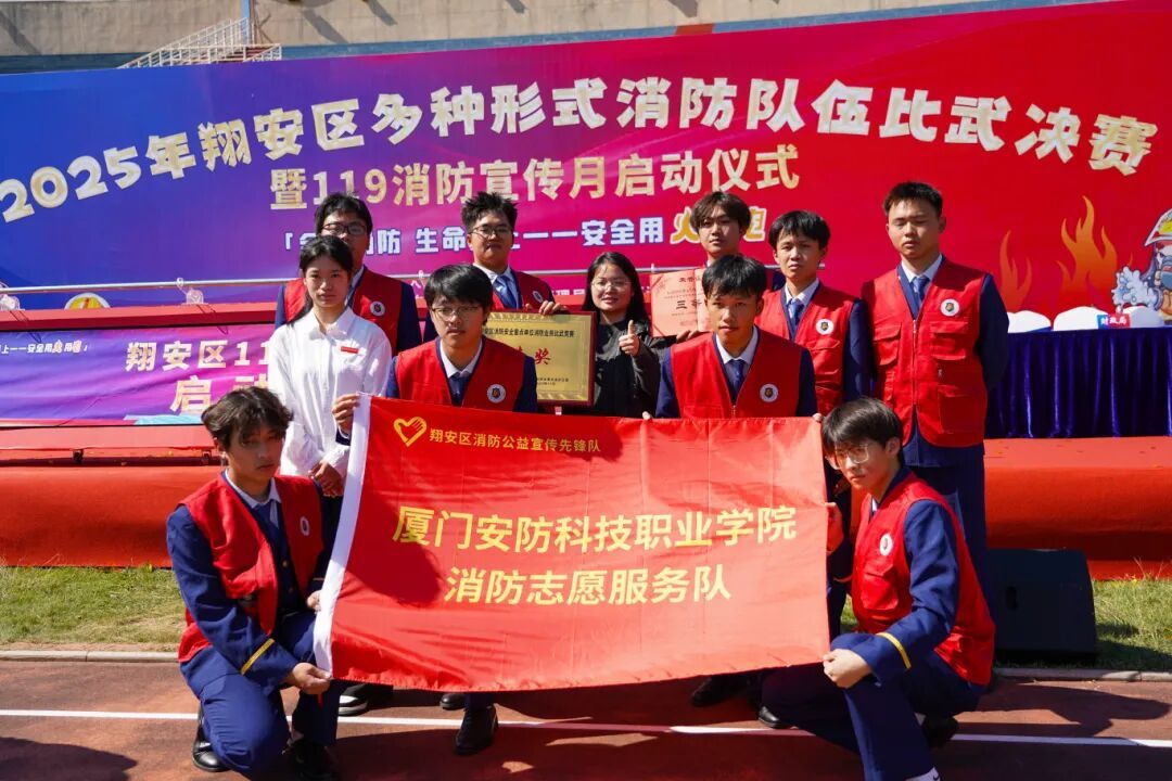 启动仪式现场举行公益志愿者队伍授旗仪式。经主办方综合考评,我校志愿服务队凭借长期以来在消防志愿服务领域的扎实工作、突出表现及良好社会反响,与翔安区鹭岛消防志愿服务队等5支队伍一同被授予“消防公益宣传先锋队”称号。